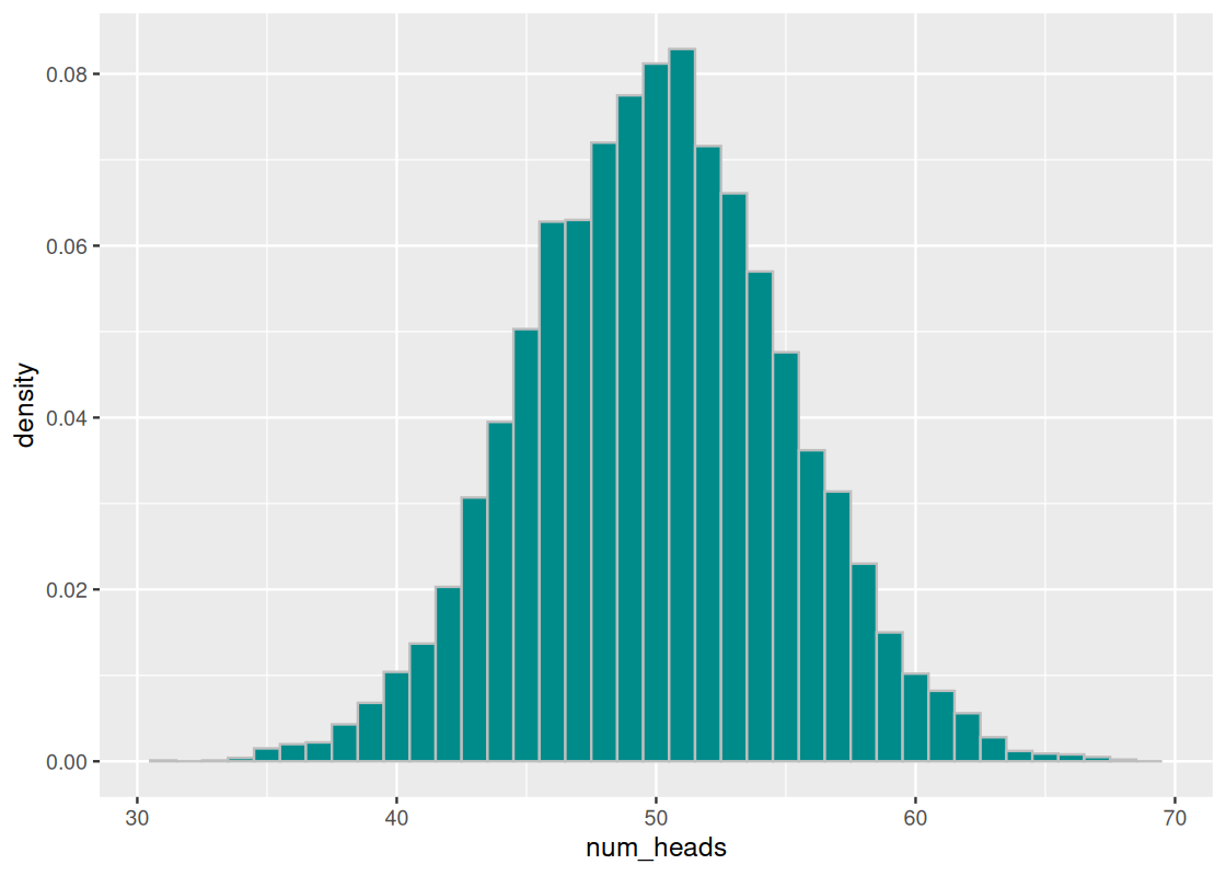 hist_from_simulation()produces a histogram of the simulated gains you generated.hist_from_simulation <- function(simulated_results) { wins_tibble <- tibble( repetition = 1:length(simulated_results), gain = simulated_results ) g <- ggplot(wins_tibble) + geom_histogram(aes(x = gain, y = after_stat(density)), bins=12, color = "gray", fill = "darkcyan") return(g) } hist_from_simulation(simulated_gains) Question 3.6 What value does the bulk of the data center around? Does this agree with or contradict our earlier analysis in Question 3.2?
