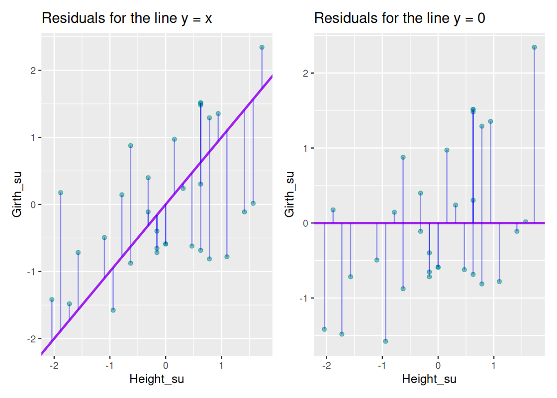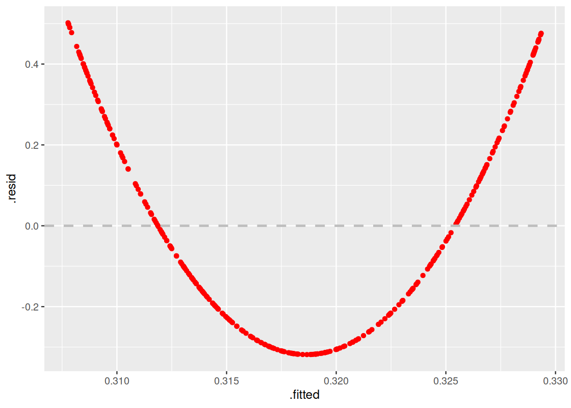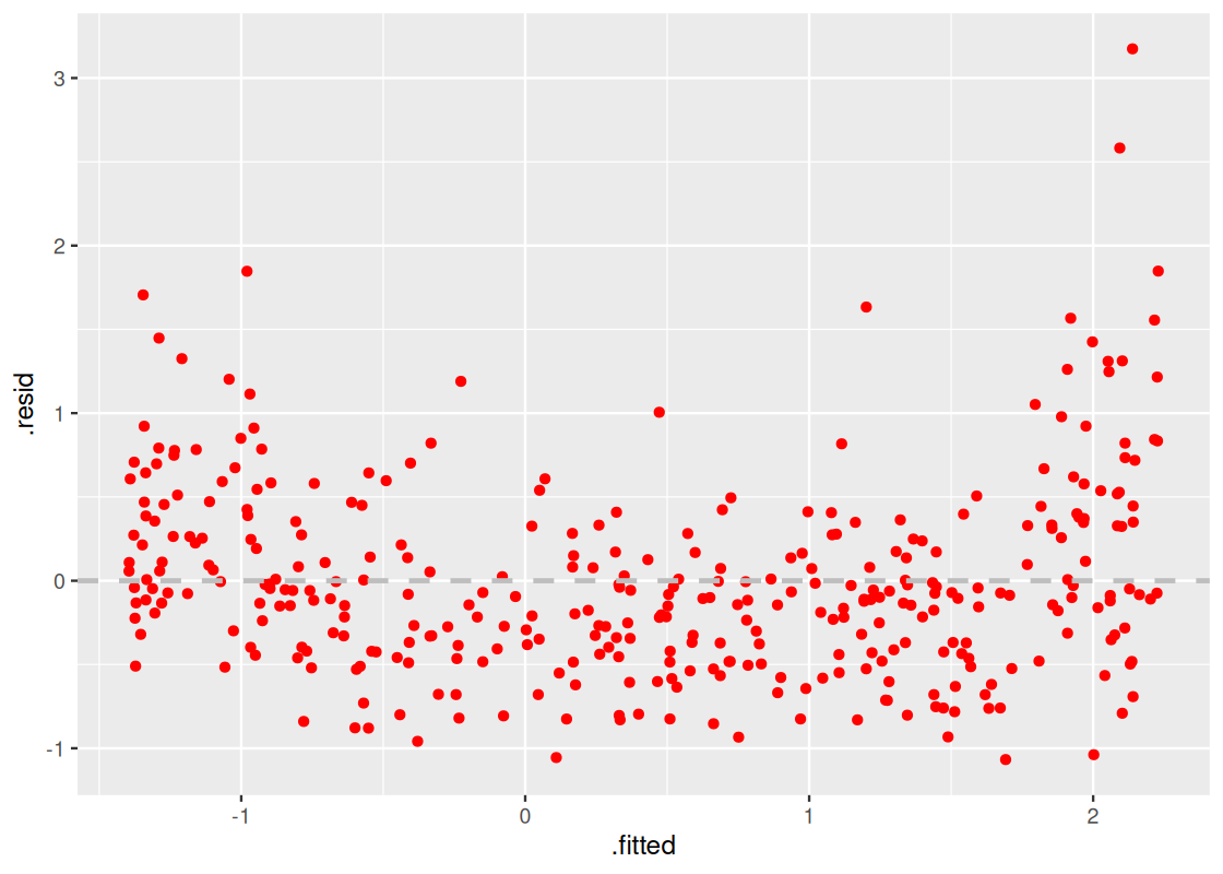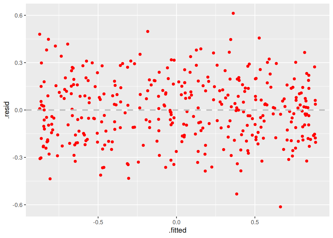 If a regression fits a scatter plot well, then the residuals from our regression model should show no pattern when plotted against the predictor variable. This is called the residual plot. Section 11.4 shows how we can use ggplot to generate a residual plot from a parsnip linear model.