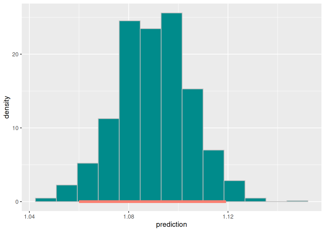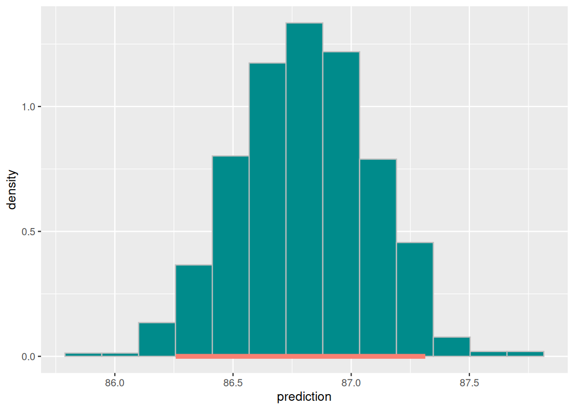 lmod_simplefrom Question 1 to make a prediction about its popularity. However, we know that we can’t give an exact estimate because our prediction depends on a sample of 85 different candies being matched up!Instead, we can provide an approximate 95% confidence interval for the prediction using the resampling approach in Section 11.3. Recall that such an interval goes by a special name: confidence interval for the mean response.
