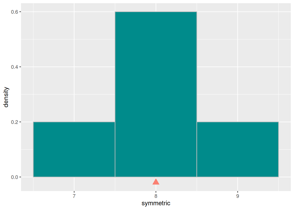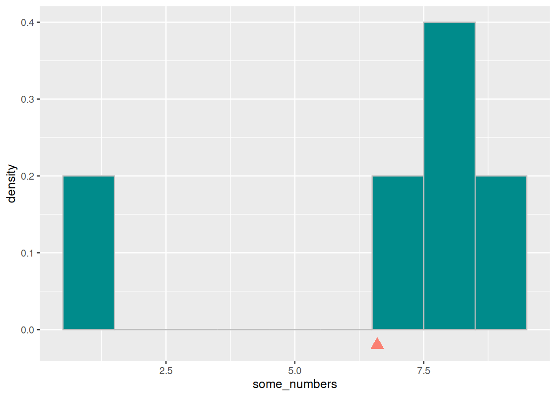 letter_tibble.letter_tibble <- tibble( letter = LETTERS[1:26], stat = letter_group_stats) Question 5.8 Augment your histogram from Question 5.2 with the computed statistics you found from the head sample, tail sample, and the convenience samples. Use a point geom for each statistic.